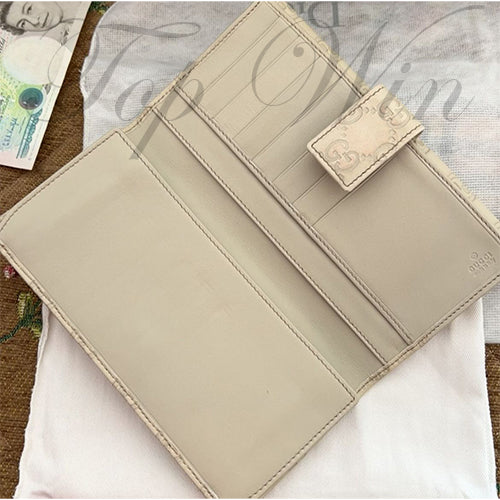 This stylish wallet is made of black Gucci GG embossed leather and features a front flap and a gold medal with the Gucci name logo. Once opened, it reveals a matching leather interior with large pockets, patch pockets and card slots. This is an excellent wallet, practical and chic, with Gucci's sophisticated style!