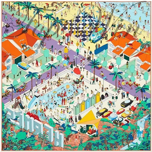 Designer Ugo Bienvenu has written an ode to carefree summer holidays by the sea. A futuristic seaside resort inspired by American comics comes alive with tourists. A superwoman flies gracefully over the city, while fearless teenagers let their hair down on the rooftops. Glittering racehorses race along the promenade, while holidaymakers relax by the pool. And look, a mermaid hides in the arms of a lifeguard. Comic characters and fancy cars populate the space, making the design full of detail.