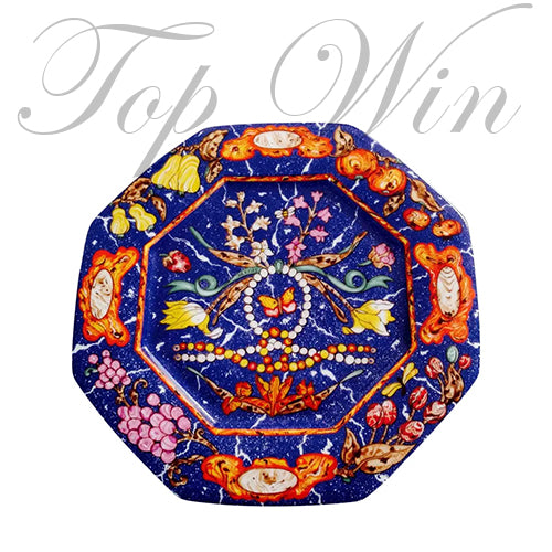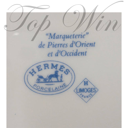 Hermes octagonal plate in Limoges porcelain decorated with "Marquetry" of stones from East and West. Multicolored on a blue background. Marked Hermes in the decor (green ribbon) and on the reverse.