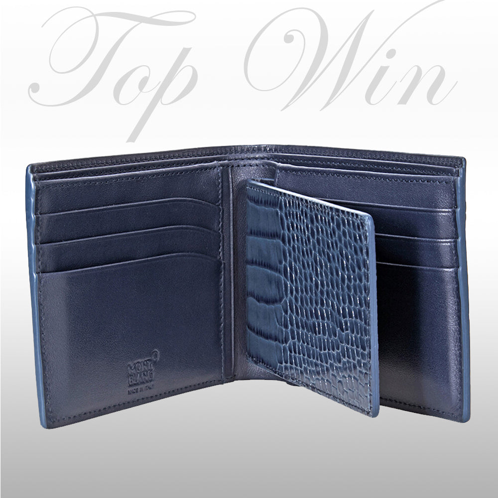 A Montblanc Meisterstuck wallet crafted in Indigo-colored embossed calfskin leather with a glossy finish and jacquard lining. This Montblanc wallet features 6 credit card slots, 2 bill pockets, 2 additional slip pockets, a removable pocket for 2 credit cards and an ID window.
