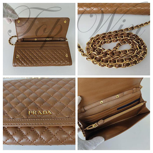 Prada brown leather quilted wallet with gold chain and detachable shoulder strap. Three compartments and multiple card pockets inside.