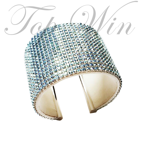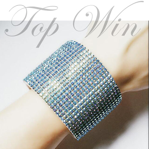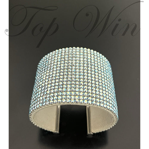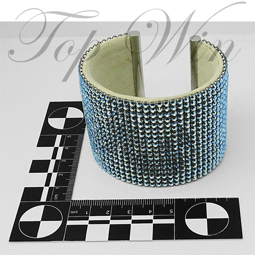 A bold large bangle cuff decorated with aqua blue Swarovski crystals. 6cm thickness. Bold and refreshing, this stainless steel bangle gleams with sparkling Aqua Blue Crystal Mesh. It has an enchanting appeal and is certain to attract attention. Comes with original box & certificate.